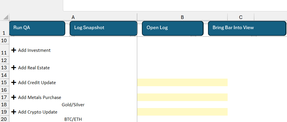 A macro-enabled Excel command dashboard for net worth, asset classes, and tax signals. Track crypto, metals, real estate, credit, and more. Every action can be logged, and QA verifies integrity.